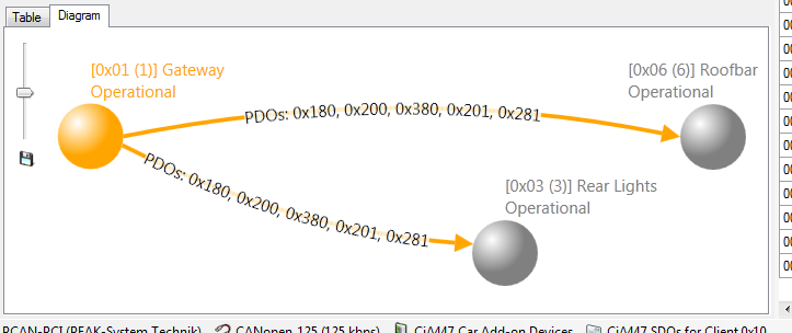 Mit einem einzigen Klick wird das Netzwerk gescannt und es werden Diagramme erstellt, die die PDO-Datenbeziehungen zwischen den Knoten darstellen.